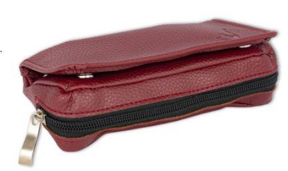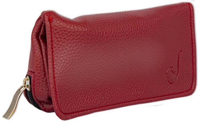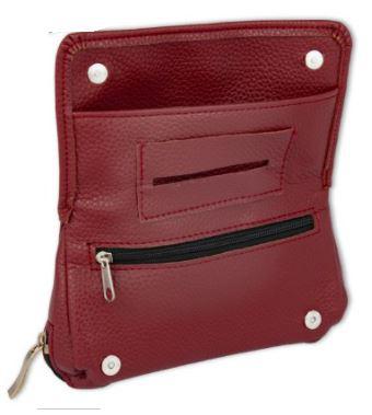 Bolsa fabricada en piel roja, con 3 bolsillos con el interior forrado en silicona para preservar la humedad. Cremalleras y botones.