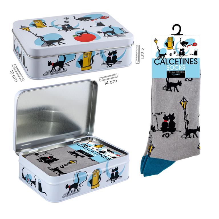 CALCETINES GRISES GATOS NEGROS+CAJA LATA DECORADA