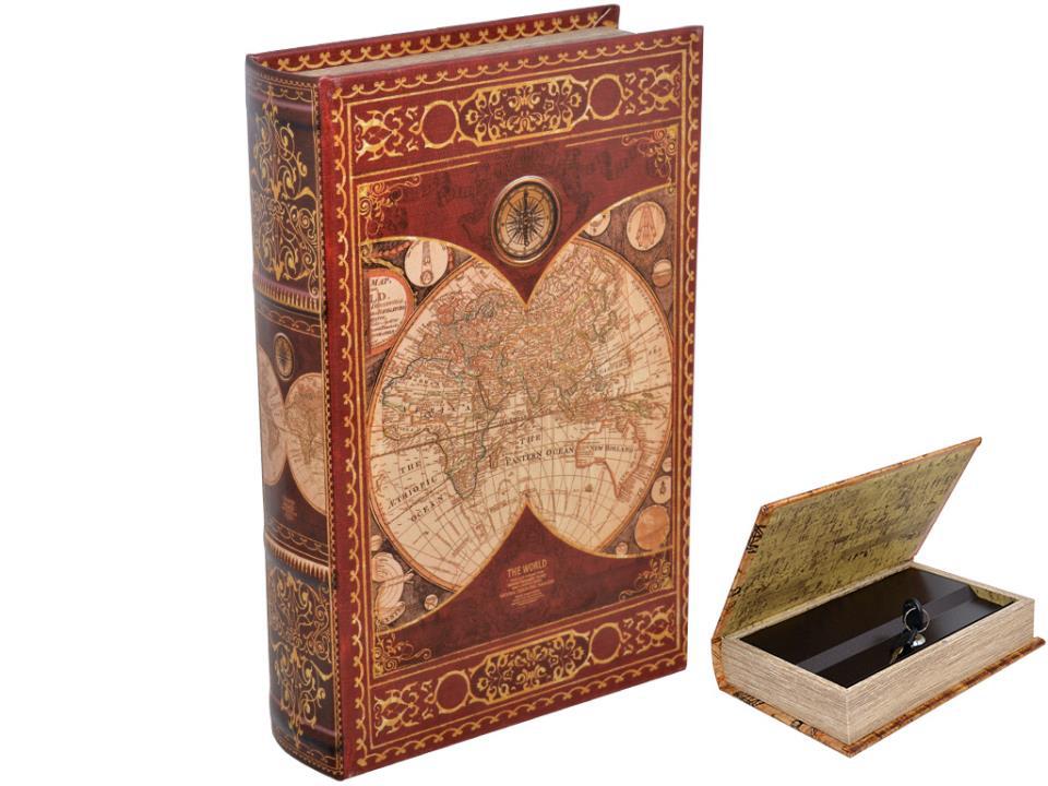 Libro-caja fuerte forma de libro con llave, modelo mapamundi marrón dos esferas