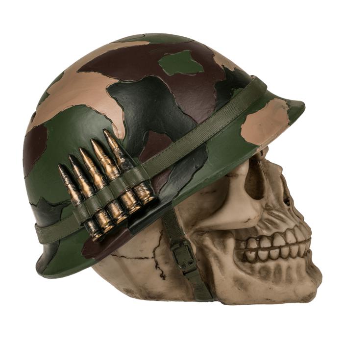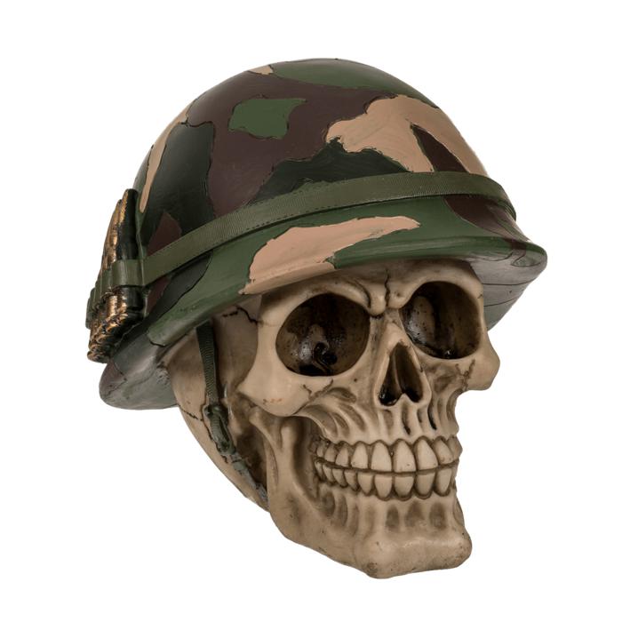 Hucha con candado, calavera con casco militar y
