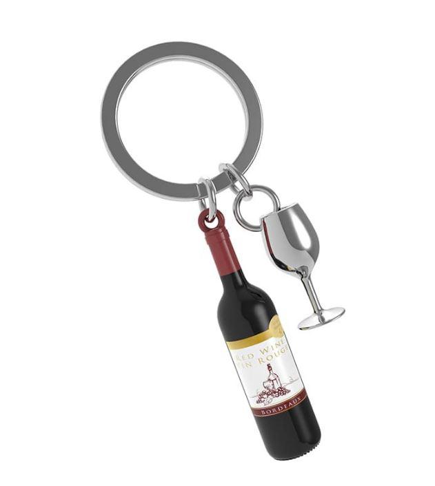 LLAVERO meta[l]morphose® Vectorbox Lifestyle – French wine bottle design – Diseño de vino francés Bordeaux y copa. Anillo de metal cromado. Diseño registrado con derechos de autor.