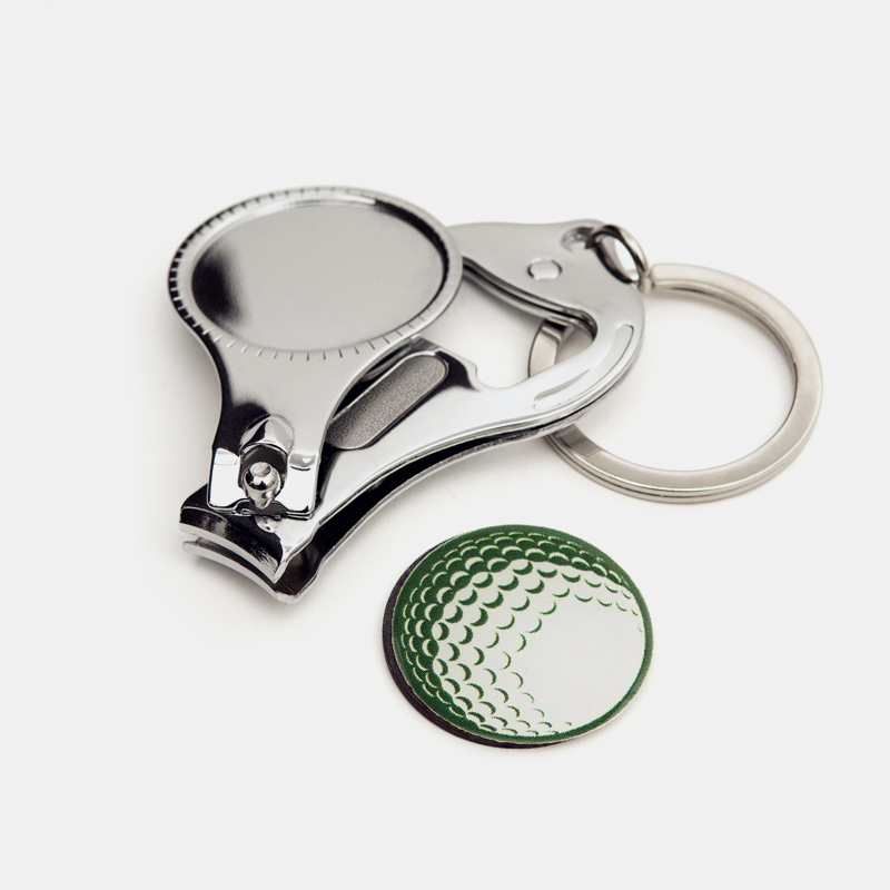 Un marcador de golf 4 en 1. Incluye llavero, abrebotellas, cortauñas y marcador.