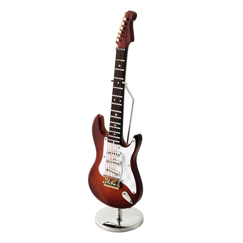 Guitarra eléctrica decorativa marrón/blanca. Miniatura en madera. Con estuche y soporte