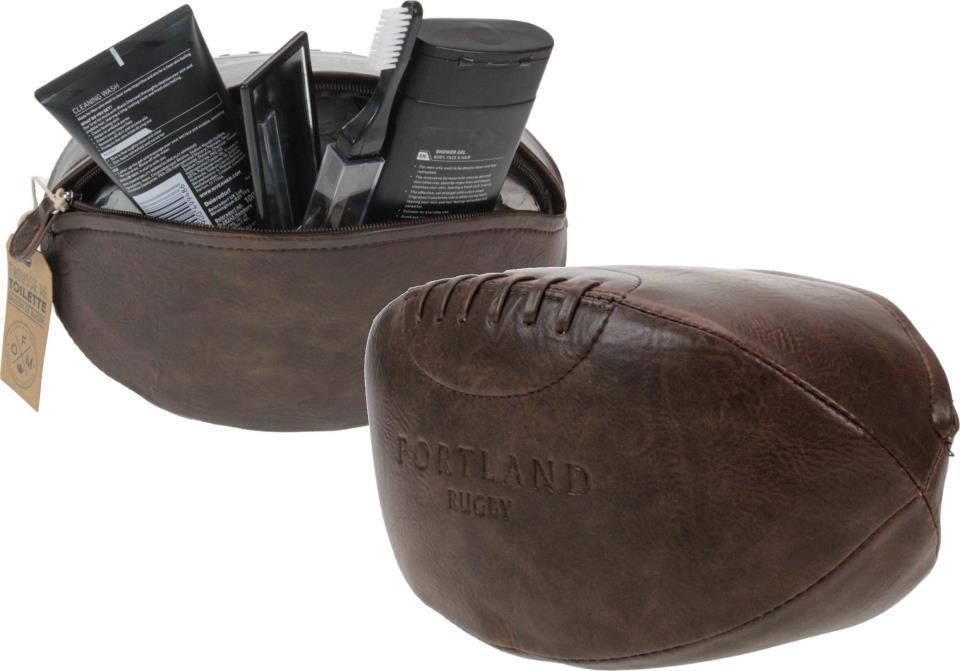 Neceser con la forma de un balón de rugby, estilo vintage en color marrón. Cierre con cremallera y el interior va perfectamente forrado.