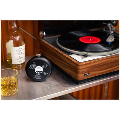 Petaca circular de 237 ml con tapón de rosca. Tiene aspecto de disco de vinilo.