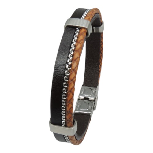 PULSERA 1 TRENZA CUERO+CADENA METAL+PIEL MARRON