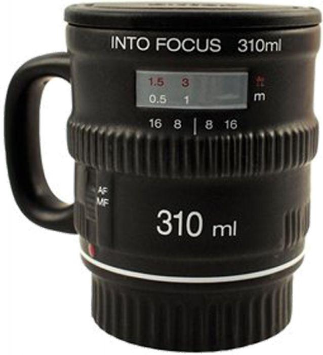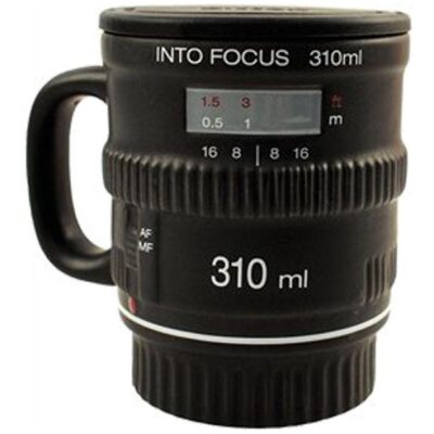 Te presentamos la «Taza cámara». Este artículo consiste en una taza de 310ml que simula el objetivo de una cámara. En la taza, el color que predomina es el negro. La taza se compone de 2 piezas; el recipiente y una tapa de silicona de color negro.